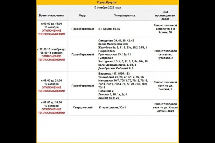 Горячую воду и отопление отключат в части двух округов Иркутска 10 и 11 октября